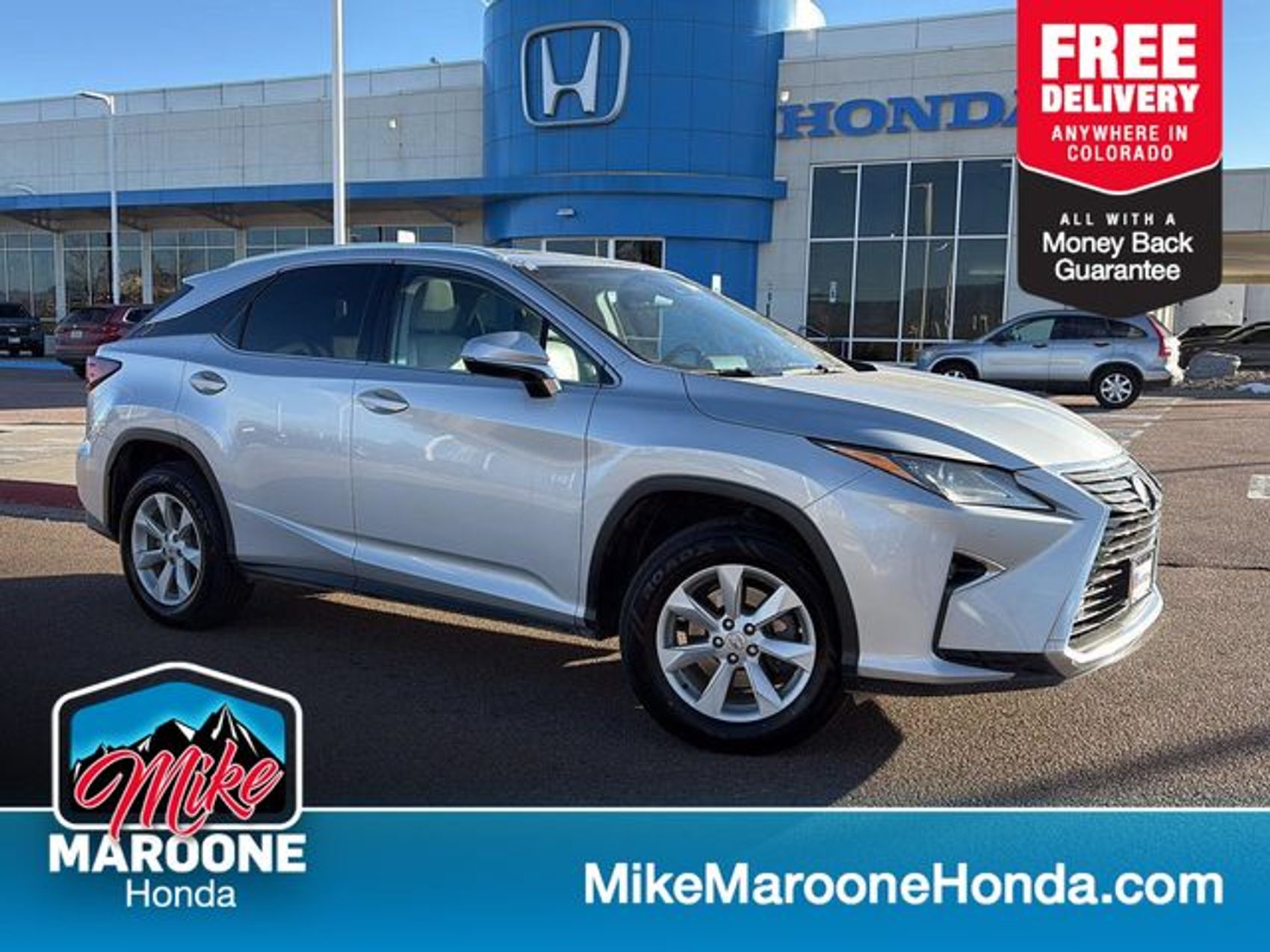 Clean CARFAX. AWD, Stratus Gray w/Leather Seat Trim, ABS brakes, Active Cruise Control, Alloy wheels, Auto High-beam Headlights, Backup Monitor, Compass, Delay-off headlights, Electronic Stability Control, Electronic Stability Control, Front dual zone A/C, Front fog lights, Fully automatic headlights, Heated door mirrors, Illuminated entry, Low tire pressure warning, Power Liftgate, Remote keyless entry, Traction control. 2017 Lexus RX 350 3.5L V6 DOHC 24V 8-Speed Automatic AWDHonda Dealership Serving Fountain and Pueblo, CO Drivers – Mike Maroone Honda Honda Sales, Service, and Parts in Colorado Springs, CO If you have been longing to get into a new Honda close to Colorado Springs, CO, then right now is an ideal opportunity to find your next auto at a low cost, here at Mike Maroone Honda. From Honda’s popular small cars like the Fit, Civic, and HR-V to the versatile CR-V and Pilot SUVs and new Ridgeline pickup truck, each new Honda model can be found here at our Colorado Springs, CO dealership. Discover your new Honda in Colorado Springs now, or visit our dealership for a test spin of your dream car.