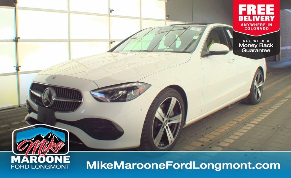 Recent Arrival! This vehicle is located at Mike Maroone Ford Longmont, 235 Alpine St, Longmont, CO 80501, please call (303) 776-2861 for more information. Clean CARFAX. CARFAX One-Owner. FREE DELIVERY ANYWHERE IN COLORADO, 2025 Mercedes-Benz C300 4MATIC, 2.0L Turbocharged Engine w/ 4MATIC All-Wheel Drive, 9-Speed Automatic Transmission, Polar White Exterior, Macchiato Beige MB-Tex Interior, LED Headlamps & Adaptive Highbeam Assist, Panorama Sunroof, Heated Front Seats, Power Front Seats w/ Memory & Driver Seat w/ Thigh Support, Dual-Zone Automatic Climate Control, KEYLESS-GO w/ Hands-Free Access, Remote Start via Mercedes Me Connect, Garage Door Opener, Power Folding Mirrors, Rain-Sensing Wipers, Burmester Premium Surround Sound System, MBUX Multimedia System w/ Touchscreen Display, Apple CarPlay & Android Auto Integration, Wireless Charging w/ NFC Pairing, 12.3″ Digital Instrument Cluster & Central Display, Navigation System, Dynamic Select Drive Modes, Active Brake Assist, Blind Spot Assist, Active Parking Assist w/ PARKTRONIC, Surround View System, Traffic Sign Assist, Driver Monitoring & Attention Assist, eCall Emergency System, Interior Ambient Lighting (64-Color), Finger Print Scanner, Advanced Package, 18″ 5-Spoke Alloy Wheels, All-Season Tires, Total Suggested Price $53,050. White 2025 Mercedes-Benz C-Class C 300 4MATIC® 4D Sedan 2.0L I4 Turbocharged 9-Speed Automatic 4MATIC®24/33 City/Highway MPG