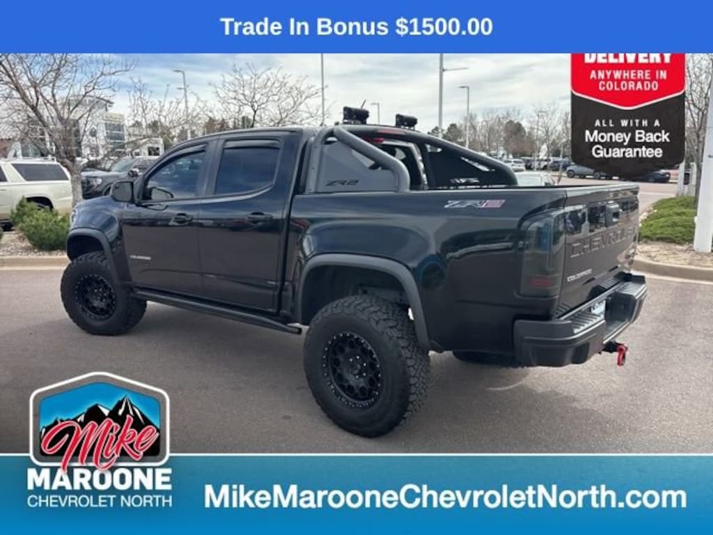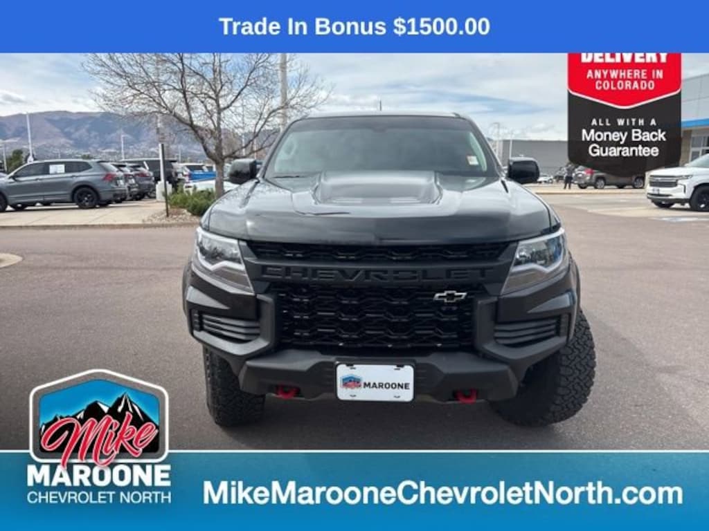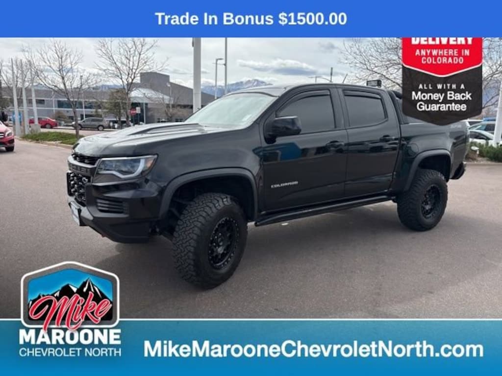 Recent Arrival! 2021 Chevrolet Colorado ZR2 4D Crew Cab 16/18 City/Highway MPG FREE DELIVERY ANYWHERE IN COLORADO **. V6 8-Speed Automatic 4WD Odometer is 2516 miles below market average!This Colorado comes with the FULL Mike Maroone a 60-Day 3000 Mileage Powertrain Warranty. We will review our technician’s vehicle inspection report with you before purchase. Our intention is to provide you a completely transparent buying experience. At Mike Maroone our used vehicles are Safety Checked, Warrantied, CarFax, and if you don’t like it ... Bring it back! For more information or vehicles like it, stop by Mike Maroone North today. We are just north of the Chapel Hills mall behind Walmart in the Chapel Hills Auto Mall.